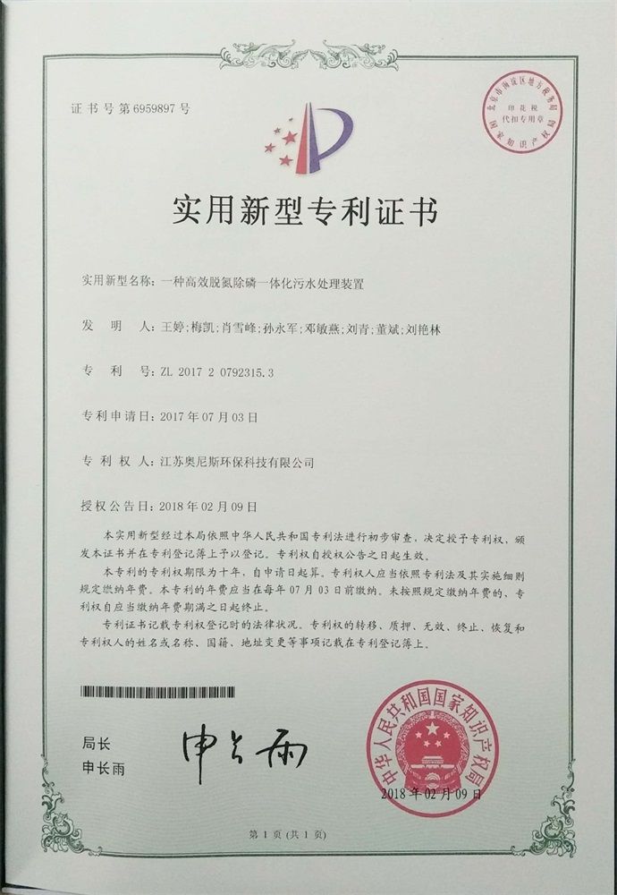 Patent Certificate for High-efficiency Nitrogen and Phosphorus Removal Integrated Sewage Treatment Device